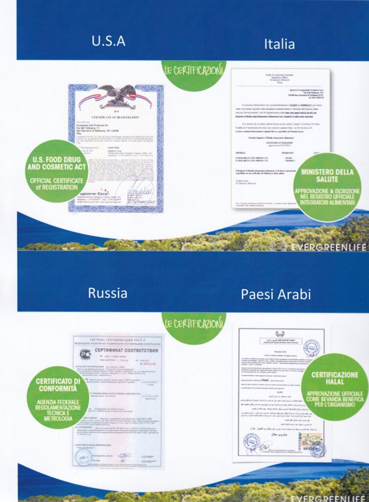 Qui di seguito l’elenco delle principali Certificazioni ottenute finora da Evergreen Life Products.